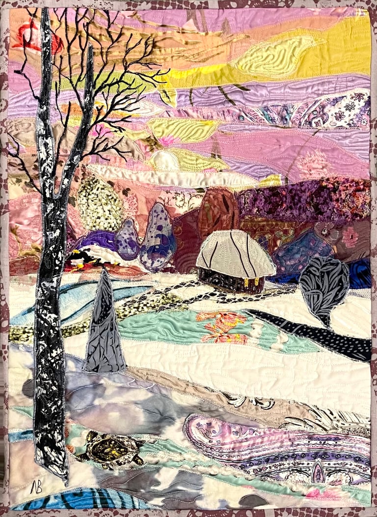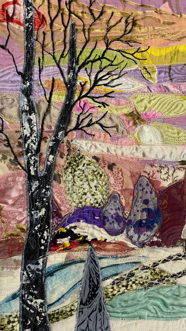 Art quilt technique, quilt collage. Fabric fragments are sewn together by hand and on a sewing machine.