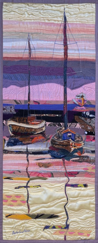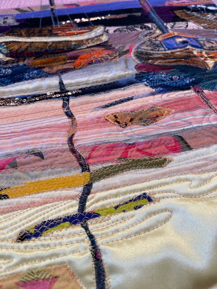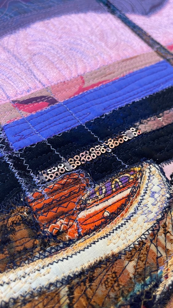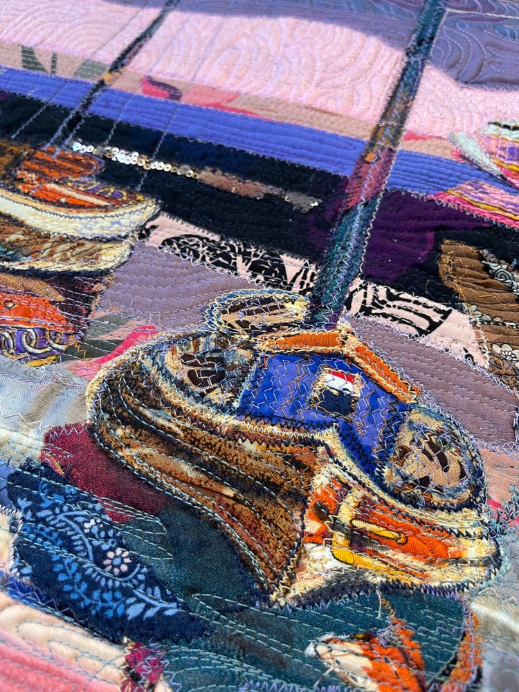 Technique: art quilt, quilt collage. Textile painting: fragments of fabrics are sewn by hand and on a sewing machine.