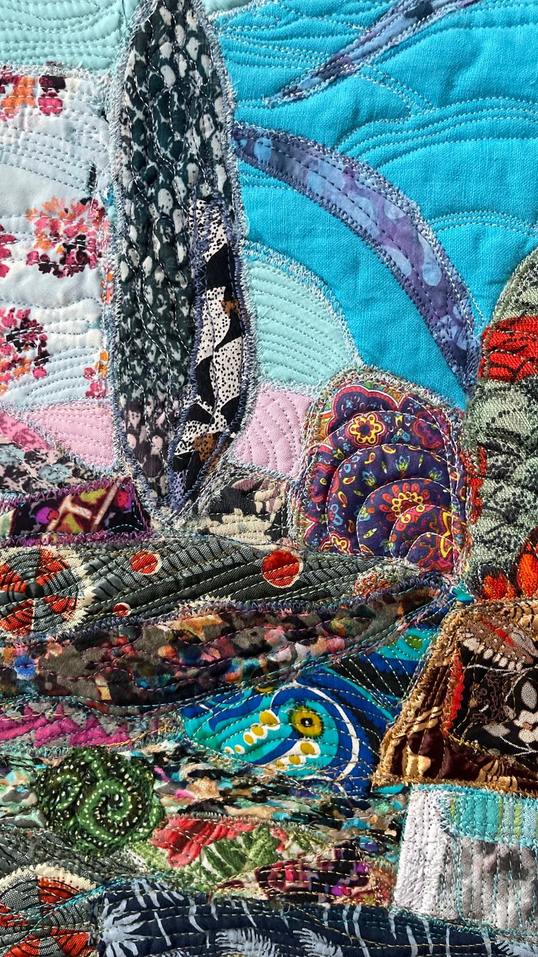 Art quilt technique, quilt collage. I sew fabric fragments by hand and on a sewing machine