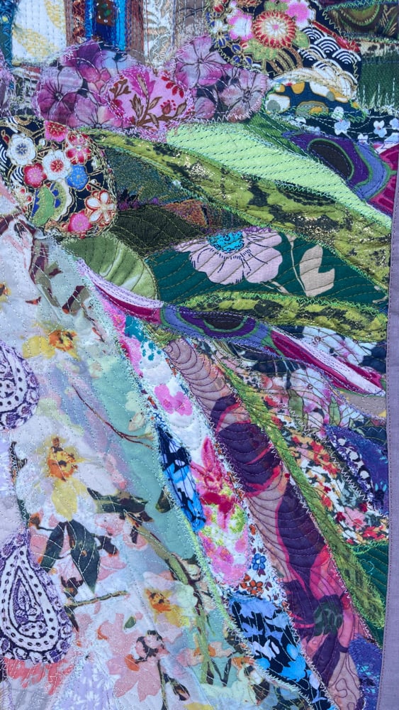Technique: art quilt, quilt collage. Textile painting: fragments of fabrics are sewn by hand and on a sewing machine.