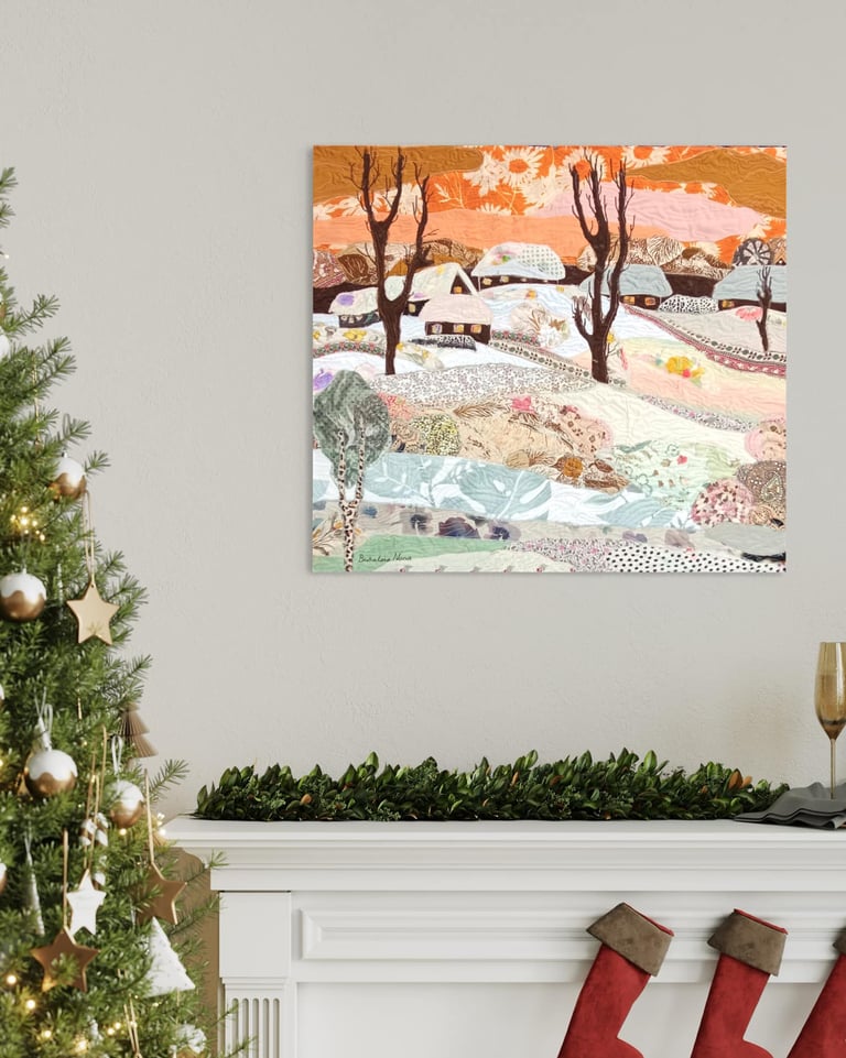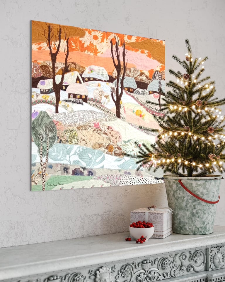 Technique: art quilt, quilt collage. I use fabric fragments of different colors, sizes and textures. I sew by hand and on a sewing machine