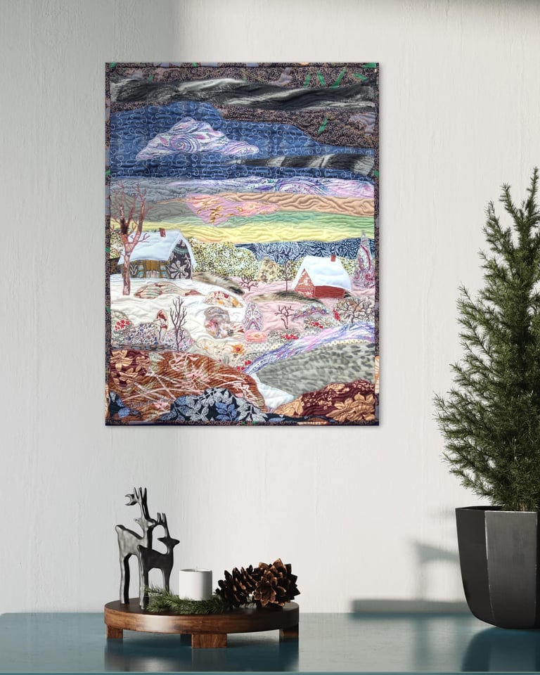 Art quilt technique, quilt collage. Fabric pieces sewn by hand and on a sewing machine