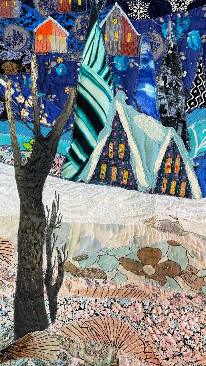 Art quilt technique, quilt collage. Fabric fragments are sewn together by hand and on a sewing machine.
