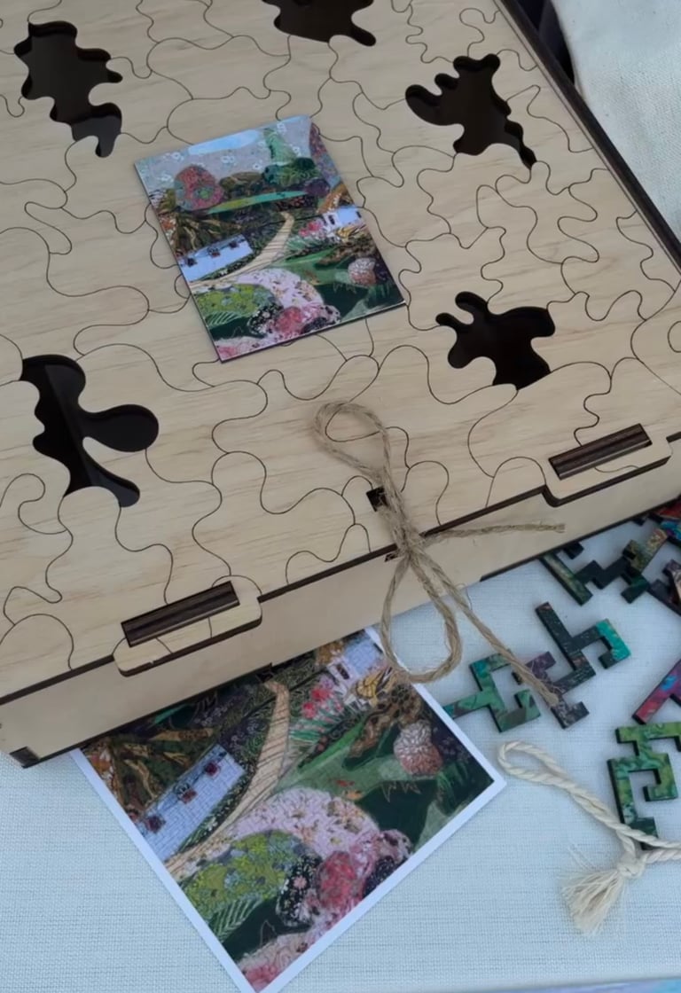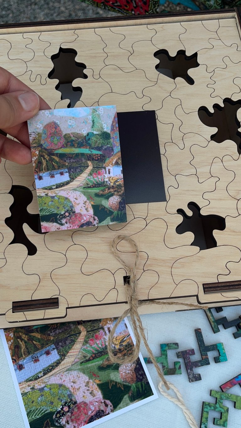 - Full version set includes: the wooden puzzle itself (30x40 cm), a puzzle bag, a printed picture of the puzzle, a wooden puzzle box, an adhesive backing sheet for fixing the work, a magnet with a picture of the work.